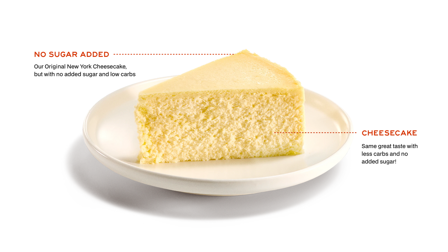 Our Original New York Cheesecake, but with no added sugar. Same great taste. Made with Xylitol (22g), an all natural sweetener.